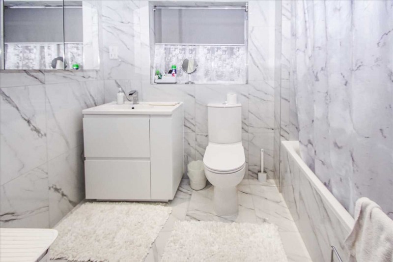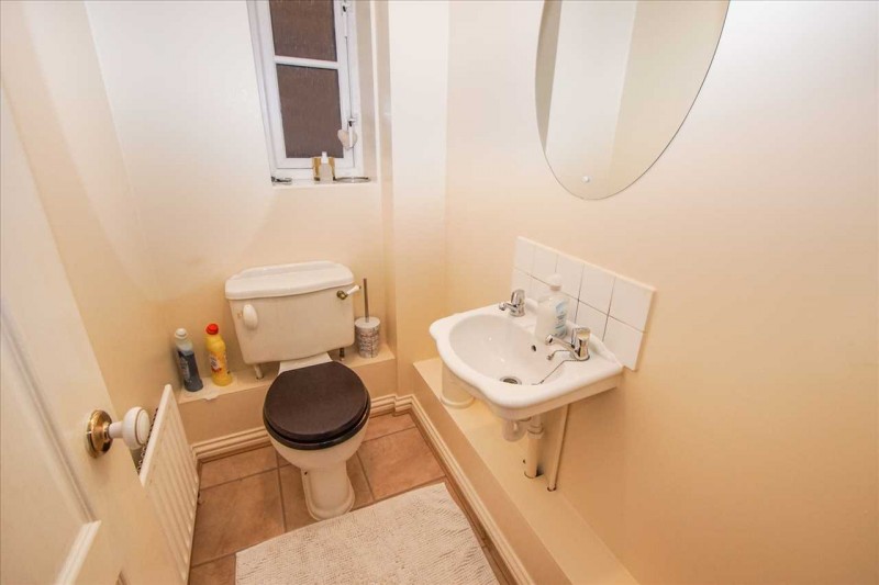 Suite comprising of a low level w.c., radiator, wash hand basin with tiled splash backs and side aspect double glazed window.