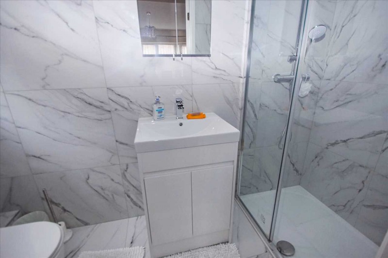 Suite comprising of an enclosed double shower cubicle, vanity unit with inset sink, low level w.c., towel radiator, side aspect window and extractor fan.