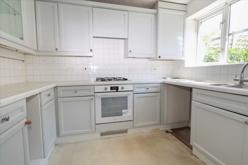 Fitted range of wall and base units with laminated work surface, cupboards and drawer space under, single drainer one a half bowl sink unit with mixer tap, intergrated gas hob with electric oven and extractor hood above, plumbing for automatic washing machine and dishwasher, appliance space, wall mounted gas boiler concealed within wall unit, tiled splash backs, laminated tiled effect flooring, front aspect double glazed window.