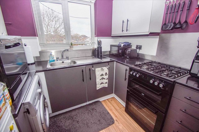 Comprising a range of eye and base level units with work surface, gas cooker point, plumbing for washing machine, wall mounted gas boiler, single bowl sink with mixer tap and rear aspect window.