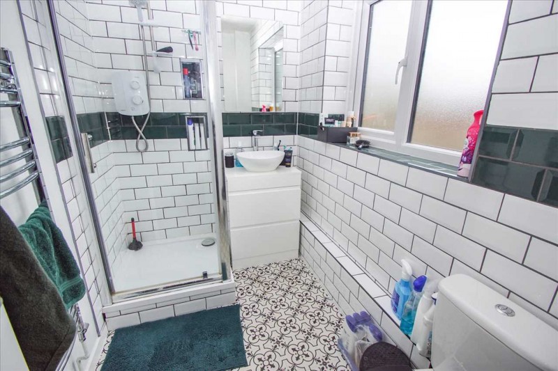 Built in shower cubicle, vanity unit with onset sink, low level w.c., towel radiator and rear aspect window.