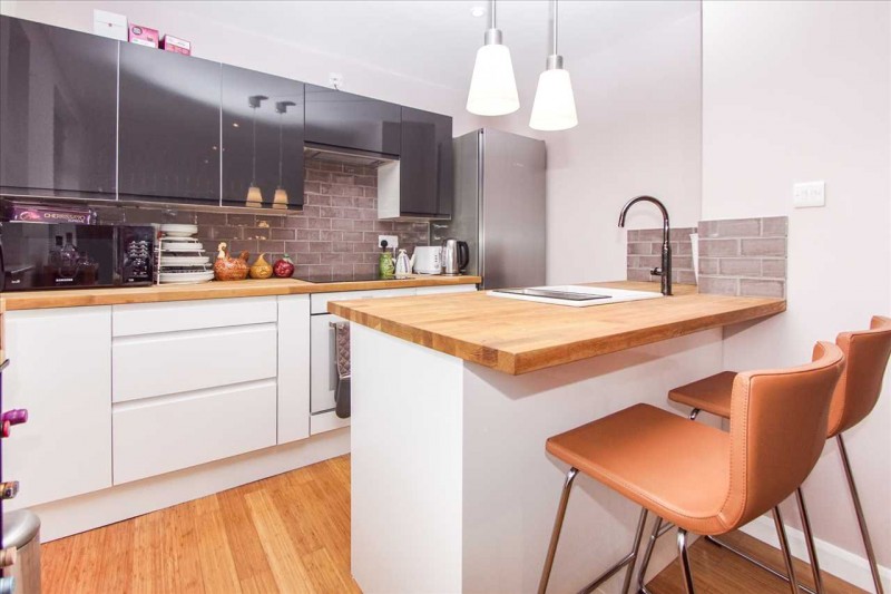 Fitted range of wall and base units with wooden counter top, single bowl sink unit with mixer tap, intergrated electric oven and hob, plumbing for automatic washing machine and dishwasher, additional appliance space, tiled splash back, recessed lighting, wooden flooring and front aspect double glazed window.