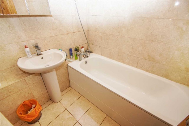 Suite comprising of an enclosed panelled bath with mixer tap and hand shower attachment, low level w.c., pedestal wash hand basin, tiled walls and flooring, extractor fan.