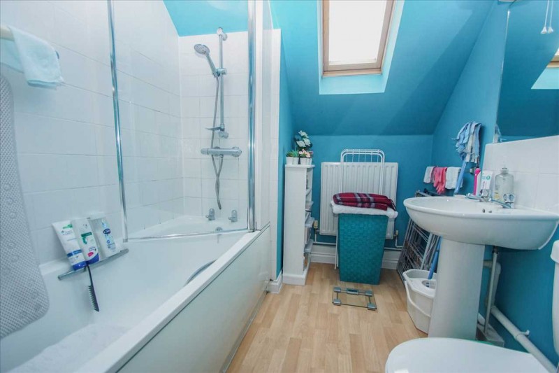 Suite comprising of an enclosed panelled bath with shower over, low level w.c., pedestal wash hand basin, vinyl flooring, radiator, velux window.