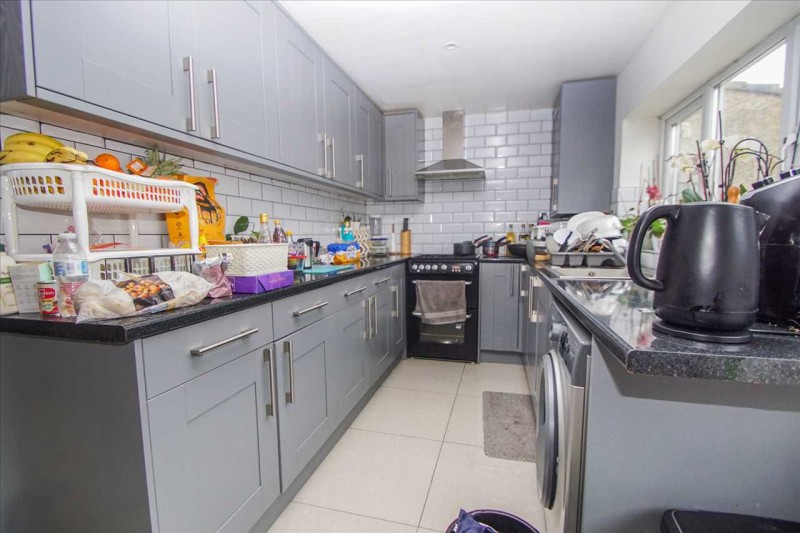 Fitted range of wall and base units with laminated work surface, cupboards and drawer space under, plumbing fort automatic washing machine, gas and electrical cooker point, single drainer sink unit with mixer tap, wall mounted gas boiler concealed within wall unit, appliance space, tiled flooring and part tiled walls, recessed lighting, rear aspect double glazed windows and door to rear garden.