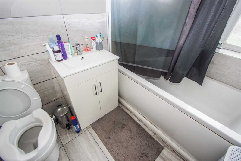 Suite comprising of an enclosed panelled bath with mixer tap and seperate shower, low level w.c., wash hand basin in vanity unit with mixer tap, tiled walls and floor, extractor fan, chrome heated towel rail, rear aspect double glazed window with obscured glass.