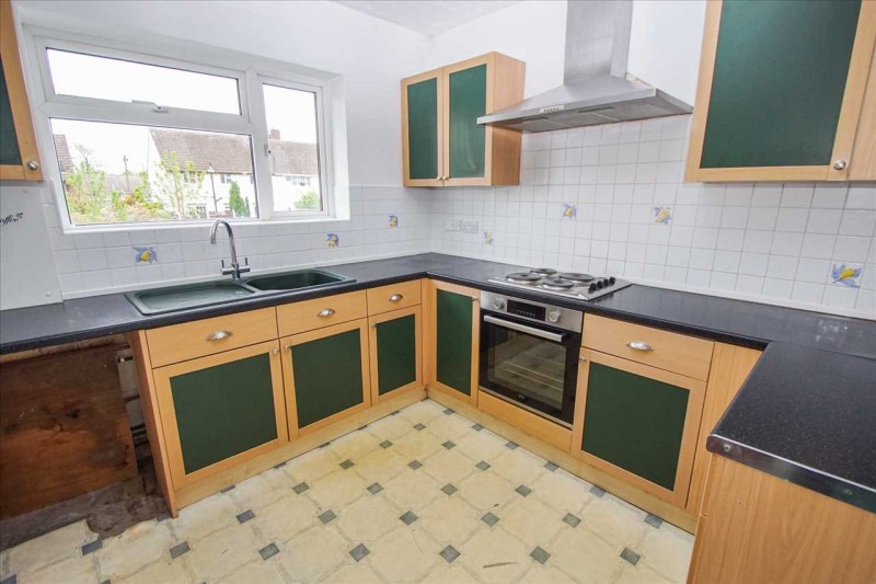 Comprising a range of eye and base level units with work surface, intergrated oven, hob and extractor, single bowl sink with mixer tap, plumbing for washing machine, tiled splash back, radiator and rear aspect window.