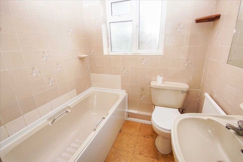 Panel enclosed bath with mixer tap and shower attachment, low level w.c., pedestal wash hand basin, airing cupboard housing wall mounted gas boiler, rear aspect window and radiator.