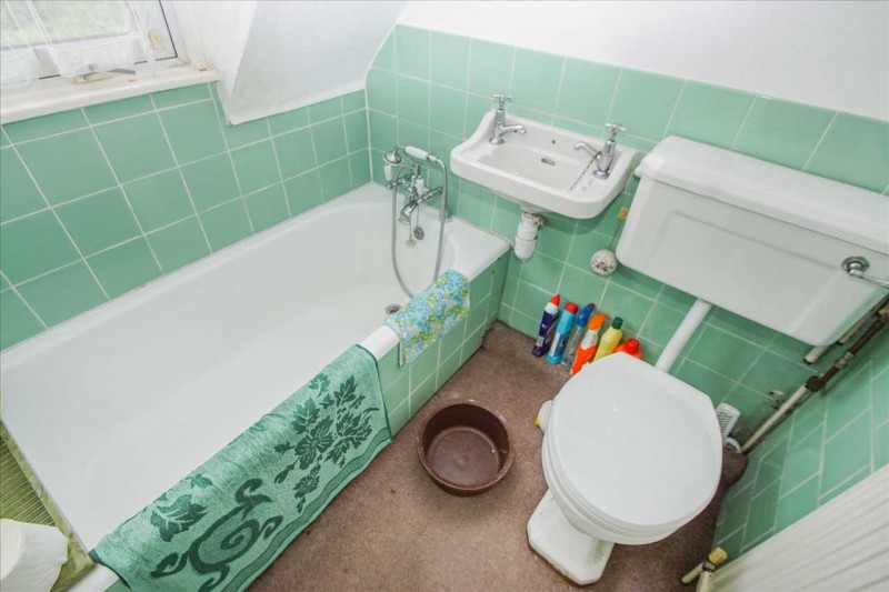 Suite comprising of an enclosed panelled bath with mixer tap and hand shower attachment, wash hand basin, low level w.c., part tiled walls and rear aspect double glazed window with obscured glass.
