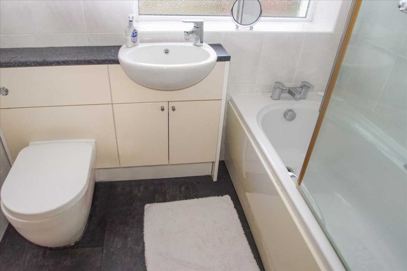 Suite comprising of an enclosed panelled bath with mixer tap and shower over, wash hand basin with mixer tap, low level w.c., heated chrome towel rail, tiled walls and rear aspect double glazed window with obscured glass.