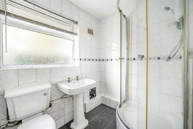 Suite comprising of an enclosed shower cubicle, pedestal wash hand basin, low level w.c., tiled walls and floor, side aspect double glazed window.