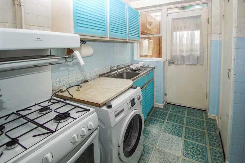 Comprising a range of eye and base level units with work surface, gas cooker point, single bowl sink, tiled splash back, rear aspect window, plumbing for washing machine and rear aspect door giving access to: