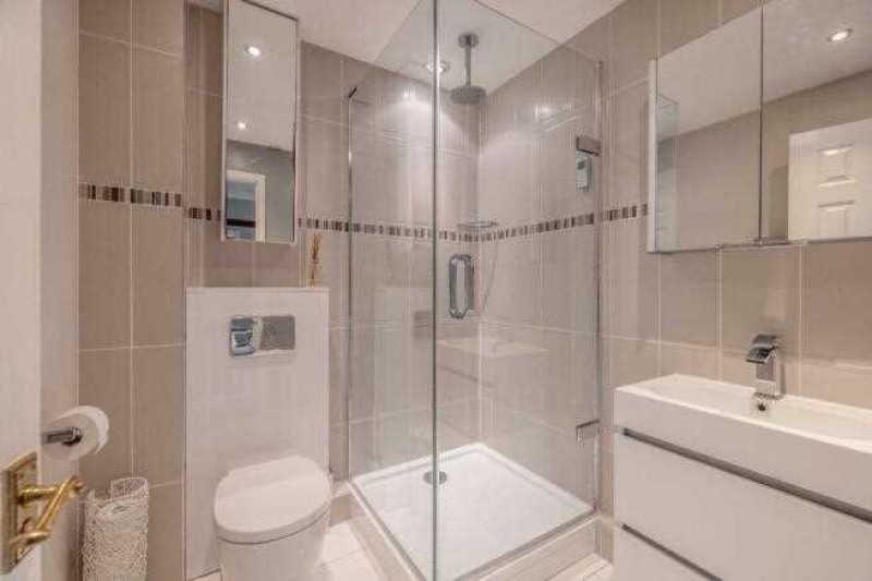 Suite comprising of an enclosed shower cubicle, wash hand basin in vanity unit with mixer tap, low level w.c., tiled walls and flooring, extractor fan and recessed lighting.