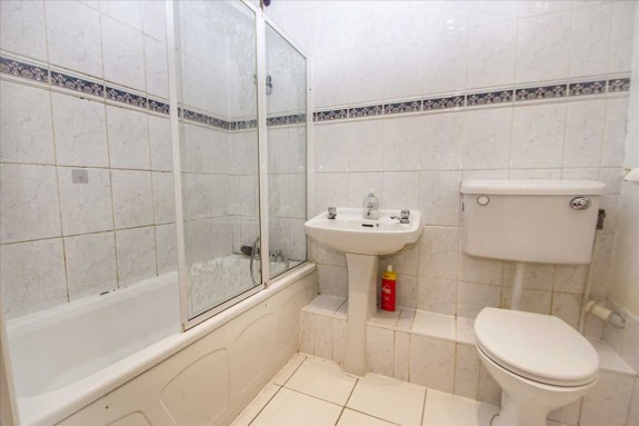 Suite comprising of an enclosed panelled bath with mixer taps and hand shower attachment, pedestal wash hand basin, low level w.c., radiator, tiled walls and flooring, radiator, extractor fan and recessed lighting.