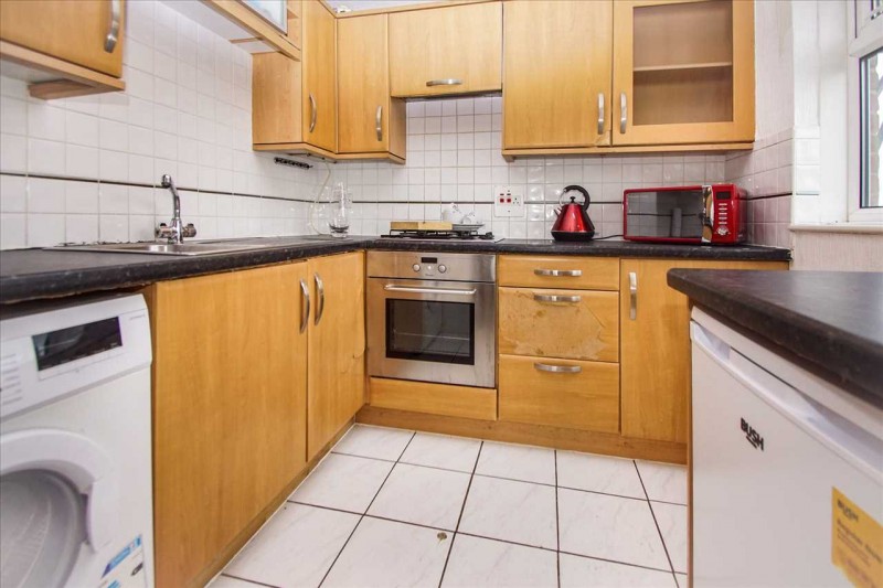 Fitted range of wall and base units with laminated work surface, cupboards and drawer space under, wall mounted gas boiler concealed within wall unit, intergrated gas hob with extractor hood above and electric oven, single drainer sink unit with mixer tap, plumbing for automatic washing machine, appliance space, side aspect double glazed window.