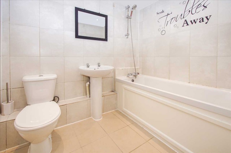Suite comprising of an enclosed panelled bath with mixer taps and hand shower attachment, low level w.c., pedestal wash hand basin, tiled walls and flooring, recessed lighting, extractor fan.