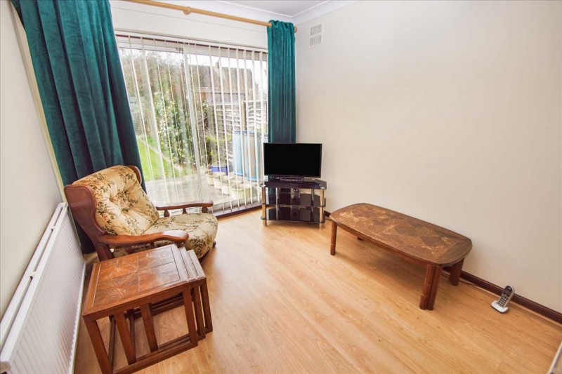 Rear aspect patio doors giving garden access, radiator and door to dining room.