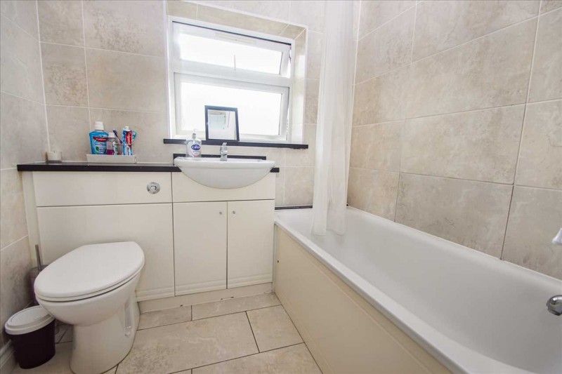 Suite comprising of an enclosed panelled bath with mixer tap and hand shower attachment, wash hand basin in vanity unit with mixer tap, low level w.c., tiled floors and walls, radiator, rear aspect double glazed window with obscured glass.
