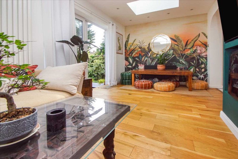 Three skylights, hardwood flooring, recessed lighting, radiator, feature electric fire within media surround, double glazed patio doors opening onto rear garden.