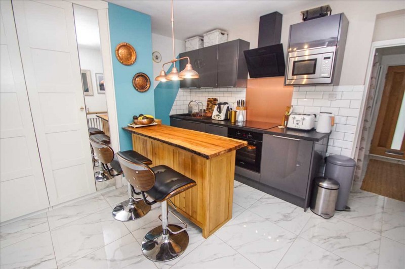Comprising of a range of wall and base units with laminated counter top with cupboards and drawers under, intergrated electric oven and hob with extractor hood above, single drainer one and a half bowl sink unit with mixer tap with seperate drinking water tap, additional storage units, appliance space, tiled flooring and radiator.