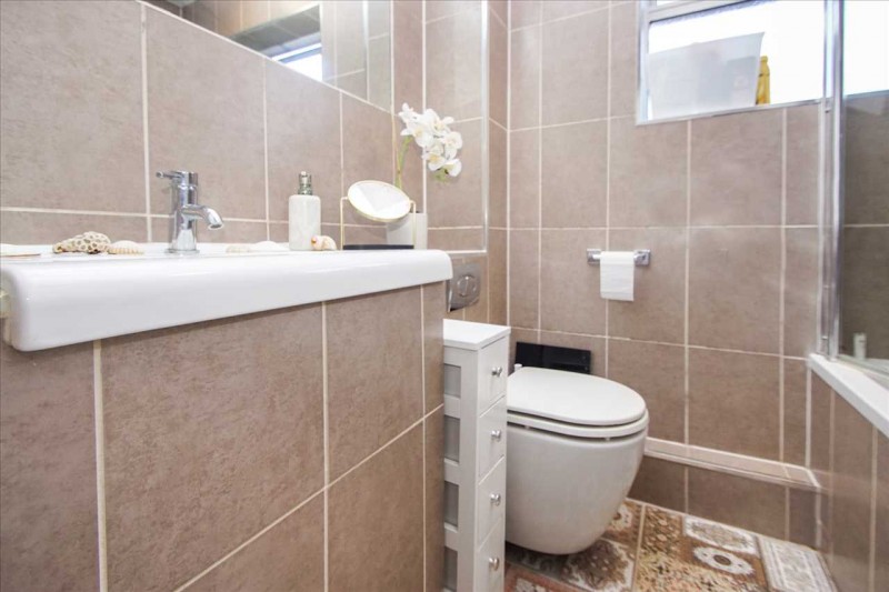 Suite comprising of an enclosed P-Shaped bath with mixer tap and hand shower attachment, shower screen, wash hand basin in tiled counter top, low level w.c., tiled walls and tiled flooring with under floor heating, heated chrome towel rail, side aspect double glazed window with obscured glass.