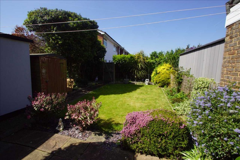 Mainly laid to lawn with flower and shrub borders, patio, garden tap, rear access, awning and brick built storage building with power and lighting.