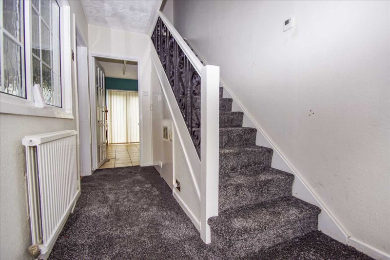 Two under stairs storage cupboard, radiator and stairs to first floor.