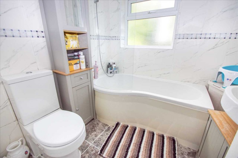 Panel enclosed P bath with mixer tap and shower attachment, low level w.c., wash hand basin, rear aspect window and radiator.