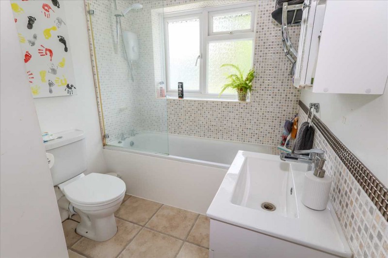Suite comprising of an enclosed panelled bath with shower over, wash hand basin in vanity unit, low level w.c.,, cupboard housing gas boiler, part tiled walls, radiator, recessed lighting, rear aspect double glazed window with obscured glass.