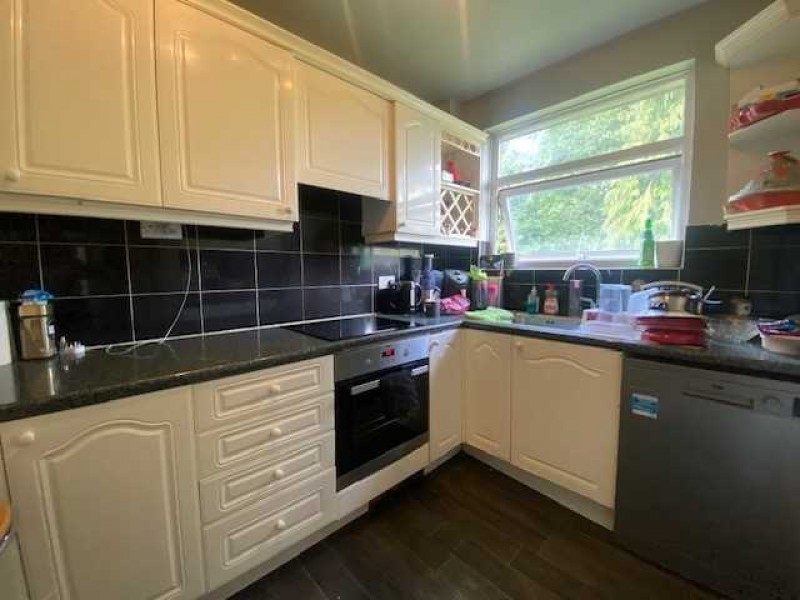 Fitted range of wall and base units with laminated work surface, cupboards and drawer space under, intergrated electric oven and hob with extractor hood above, plumbing for dishwasher, single drainer sink unit with mixer tap, tiled splash backs, front aspect double glazed window.