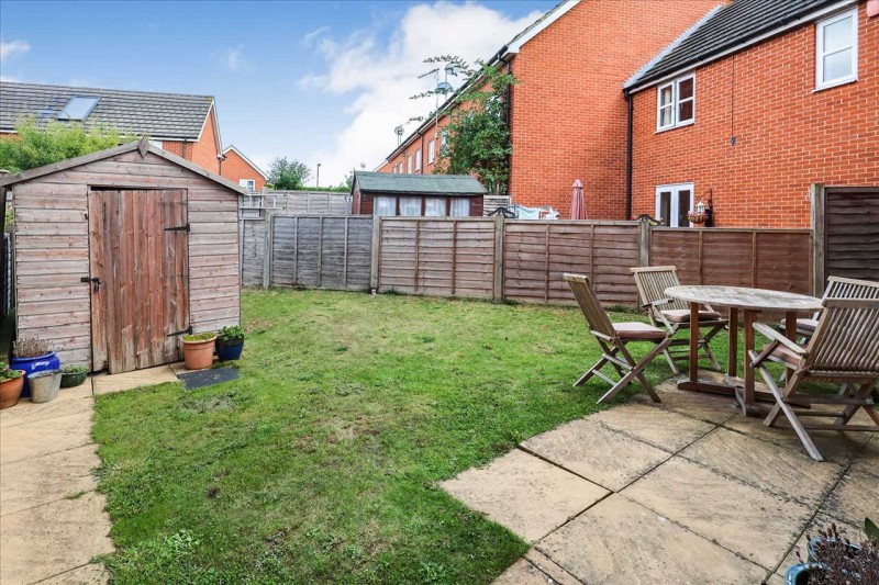 Gated side access to a privately enclosed rear garden which comprises of a paved patio area leading to lawn and timber tool shed.