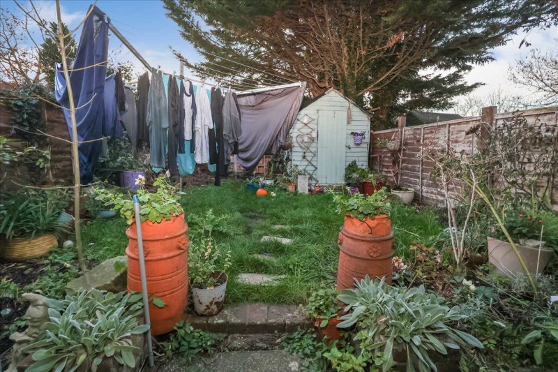 The rear garden is fully enclosed and laid to lawn with a variety of beds and borders.