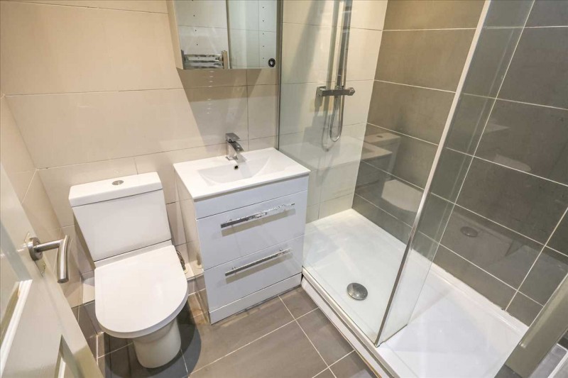 Suite comprising of a walk in shower cubical, wash hand basin in vanity unit with mixer tap, low level w.c., tiled walls and flooring, extractor fan and recessed lighting.