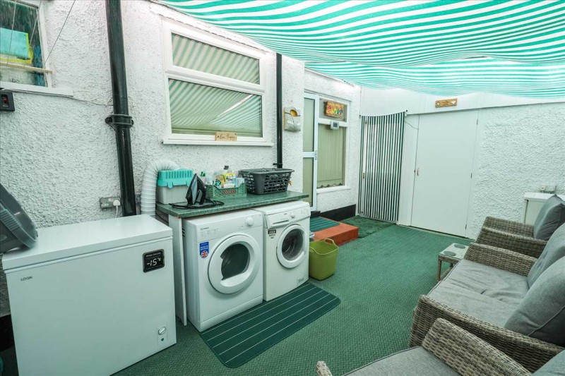 Plumbing for automatic washing machine and tumble dryer, doors to both front and rear gardens.