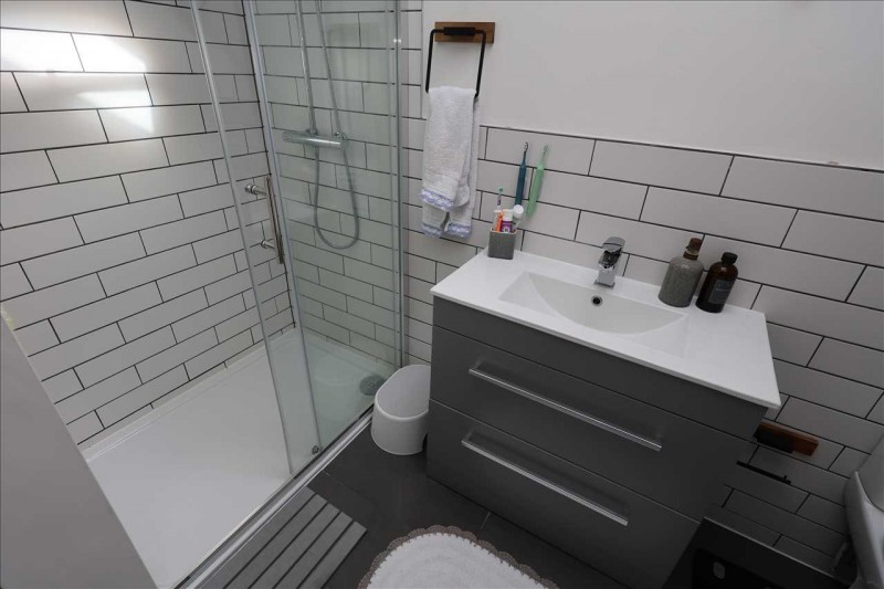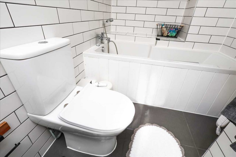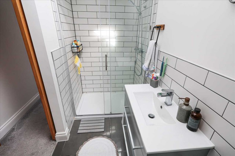 Comprising of a low level w.c., wash hand basin in vanity unit with mixer tap, wooden flooring with under floor heating, recessed lighting, part tiled walls and side aspect double glazed window with obscured glass.