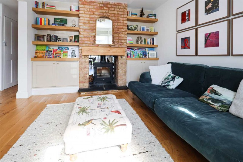 Front aspect double glazed bayed window, dual aspect log burner with storage either side, wood flooring with under floor heating.